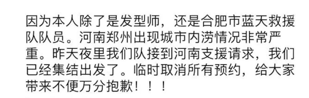 收到這條信息的時候,餘濤的妻子正在他身邊熟睡,他的第一反應是,他得過去。他小心翼翼地把妻子叫醒,告訴她他要去支援河南。 隨後他一一詢問了明天預定來店裏剪髮的客人是否可以取消預約,然後發了一條朋友圈通知大家明天他不在店裏。