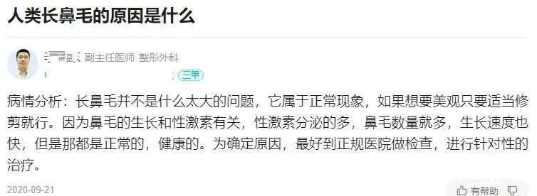 在線專家告訴你這和性激素有關,性激素分泌越旺盛,鼻毛長得越多。