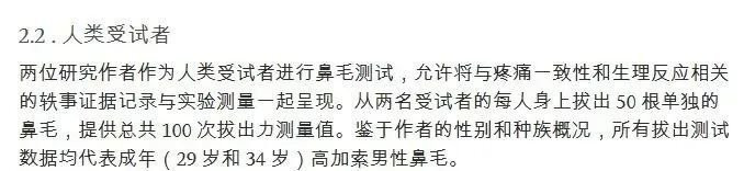 通過在自己鼻腔及同事鼻腔各拔50根鼻毛後研究人員發現一個非常反直覺的事實,他們發現拔出鼻毛所用力氣大小與鼻毛粗細無關,而是與鼻毛根尖直徑比相關。
