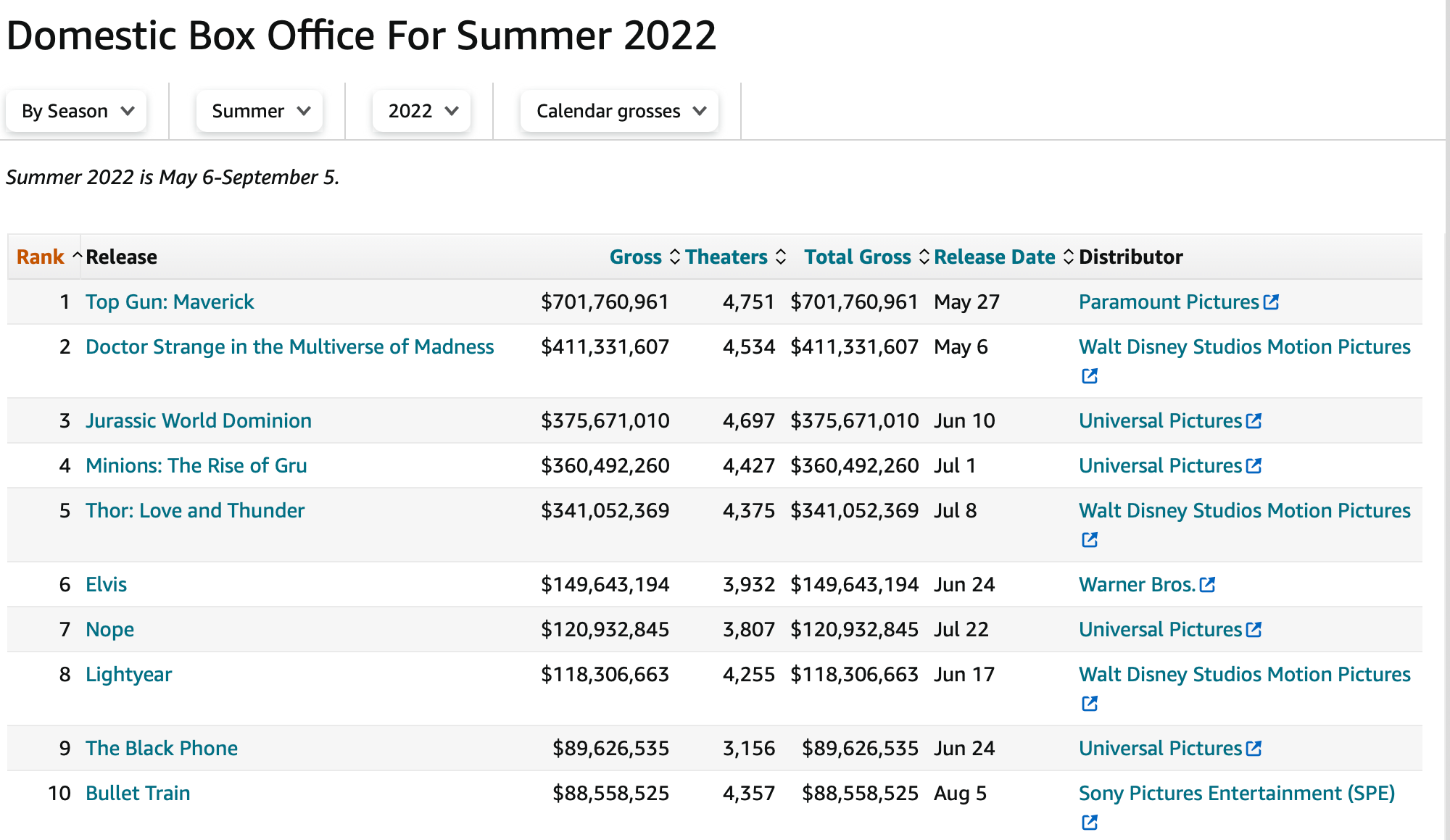 截至9月6日,北美年度總票房達到53.48億美元,比2021全年已高出8.65億美元。據The-Numbers上月發佈的展望報告,在暑期檔多片超預期表現的助推下,2022年的北美票房有望回升至74億美元,比此前的預測值調高了5億美元。