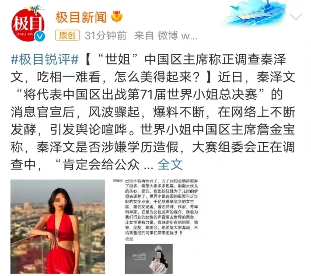 頂替原冠軍成為中國賽區代表的佳麗原先並沒有名次,履歷也被網友質疑造假,扒到最後,主辦方都出現了兩個。