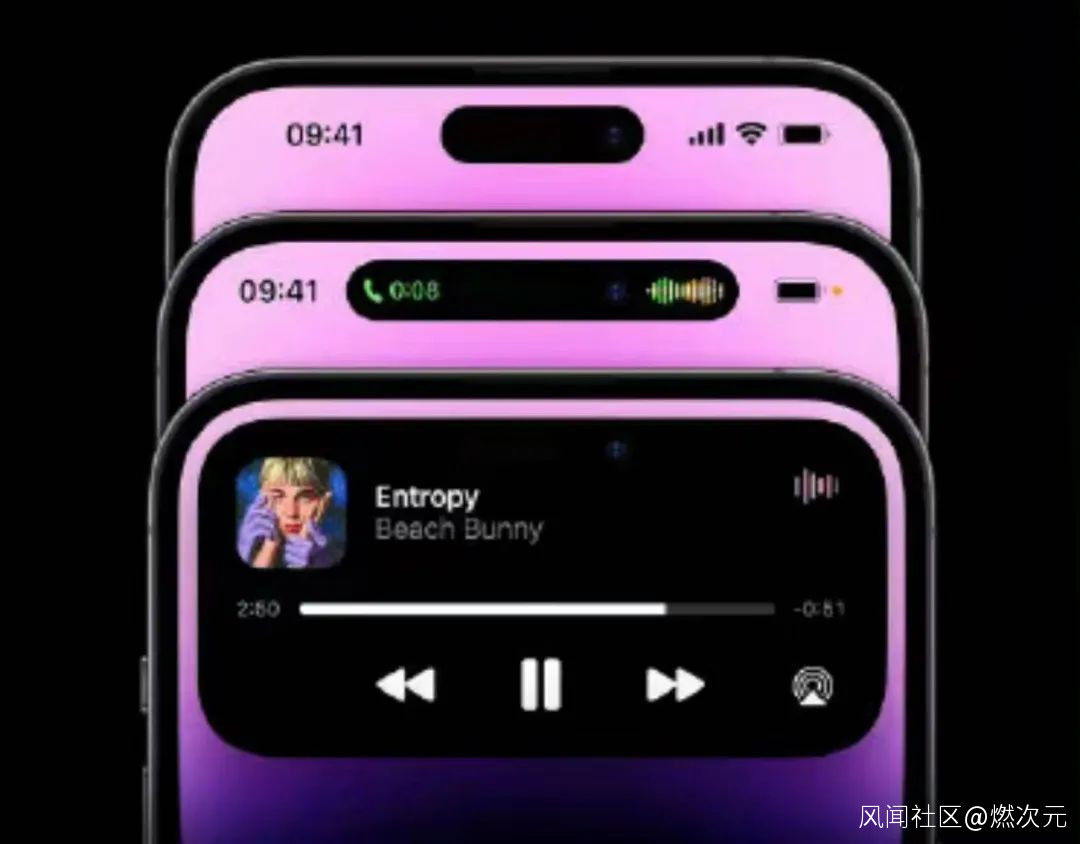 新增的“Dynamic island (靈動島)”功能,即將前置鏡頭的挖槽位置,增加新的交互方式,在前置鏡頭部分展示通知、音樂播放、通話等信息。