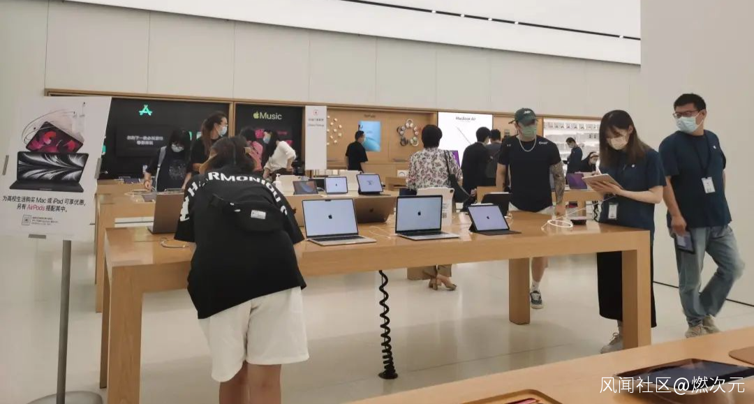 9月6日下午15時,燃次元在北京市朝陽區Apple零售店(朝陽大悦城店)停留了大概20分鐘,這20分鐘裏,手機區僅偶有一兩位客人到訪,而電腦和平板區則聚集着較多顧客。
