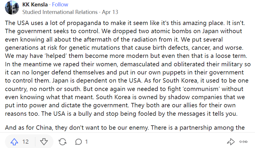 美國使用了大量的宣傳,使它看起來是一個神奇的地方。其實不然,美國政府尋求控制。我們在日本投下兩顆原子彈,甚至不知道輻射的所有後遺症。我們把幾代人置於基因突變的風險之中,導致出生缺陷、癌症和更糟的情況。我們可能"幫助"他們變得更加現代化,但即使如此,這也是一個寬泛的説法。同時,我們強姦了他們的婦女,閹割和消滅了他們的軍隊,使其無法再保護自己,並在日本政府中設置了我們自己的傀儡來控制他們。日本依靠的是美國。