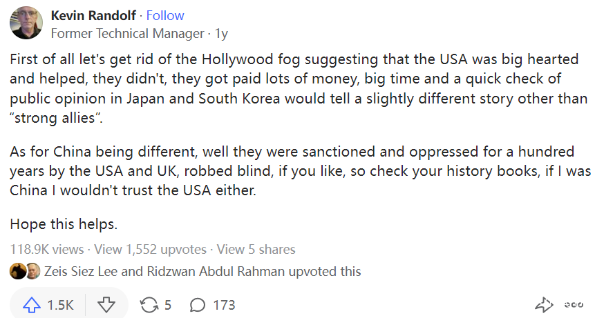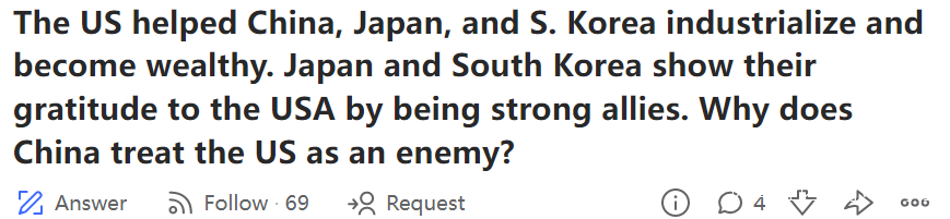 在外網有一個反華話題:**美國幫助中國、日本和韓國實現工業化並變得富有。日本和韓國通過成為強大的盟友來表達對美國的感激之情。中國為什麼把美國當成敵人?**一些國外網民發表了自己的意見。