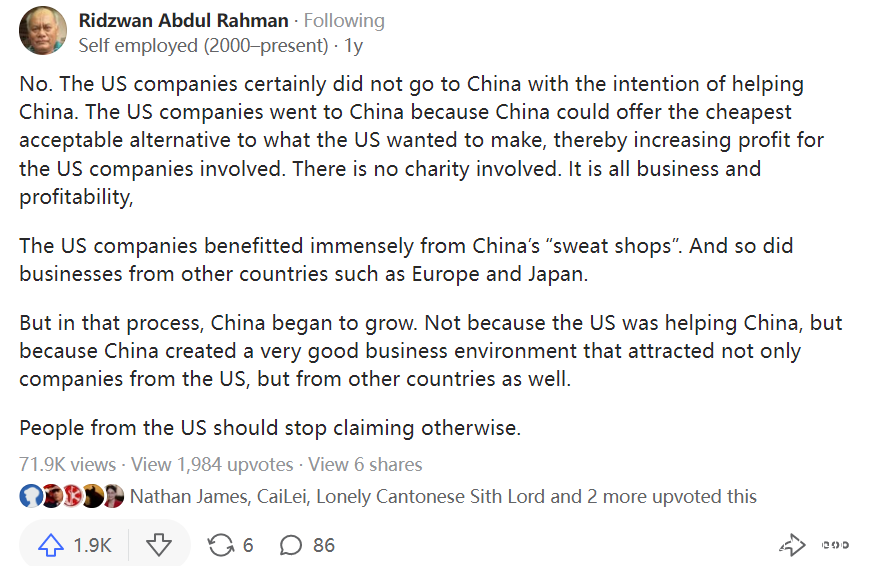 不,美國公司去中國肯定不是為了幫助中國。美國公司去中國是因為中國可以提供最便宜的可接受的替代品,以替代美國想要製造的東西,從而增加相關美國公司的利潤。這裏面沒有涉及慈善。這都是商業和盈利。
