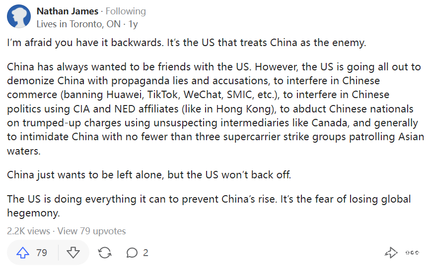 中國一直希望與美國成為朋友。然而,美國正全力以赴,用宣傳謊言和指控來妖魔化中國,干預中國的商業(禁止華為、嘀嘀打車、微信、中芯國際等),利用中央情報局和國家經濟發展局的附屬機構來干預中國的政治,利用加拿大等毫無戒心的中間人以莫須有的罪名綁架中國公民,並且一般來説,用不少於三個超級航母打擊羣在亞洲水域巡邏來恐嚇中國。