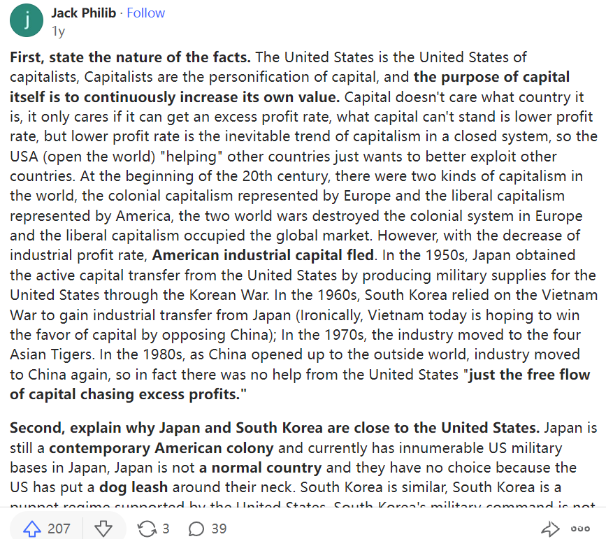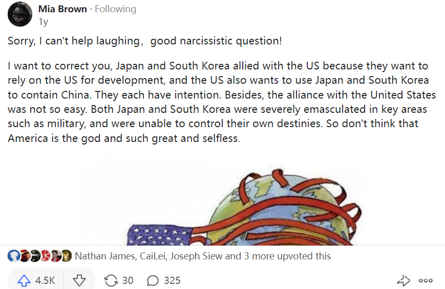 我想糾正一下,日本和韓國與美國結盟,是因為他們想依靠美國發展,而美國也想利用日本和韓國來遏制中國。他們各懷鬼胎。此外,與美國結盟並不那麼容易。日本和韓國在軍事等關鍵領域都被嚴重削弱,無法掌控自己的命運。所以不要以為美國是神,是這樣偉大無私的。