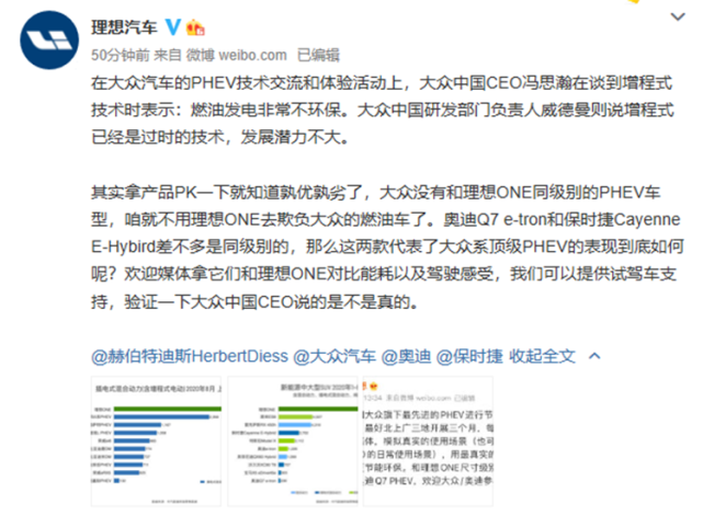 大眾的兩名高管曾下了論調,增程式早就過時了。這句話直接點燃了李想的怒火。