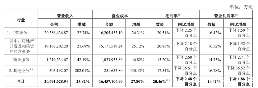 但可以看出的是,萬科上半年尤其是第二季度的淨利潤增速明顯不及營收增速,背後原因在於毛利率的下滑。今年上半年,萬科毛利率為20.46%,較去年同期下降2.48個百分點,其中開發結算毛利率為21.9%,較去年同期下降3個百分點。