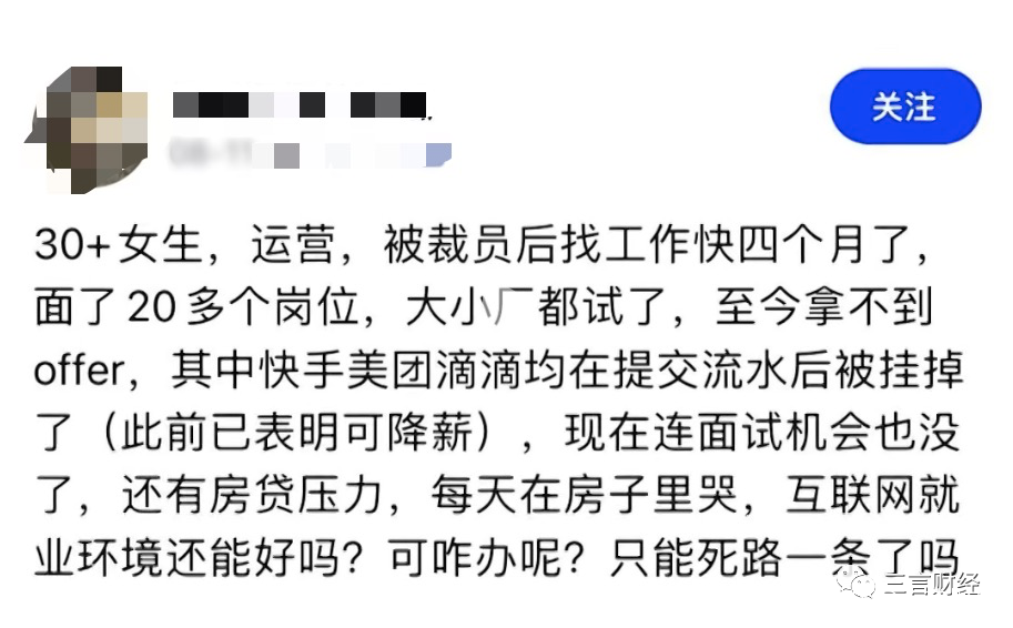 某互聯網大廠運營被裁後發文稱,自己找工作找了近4個月,面試了20多個崗位,大小廠都試了,至今拿不到offer。其中有幾家大廠在自己表明可降薪後,仍然掛掉。