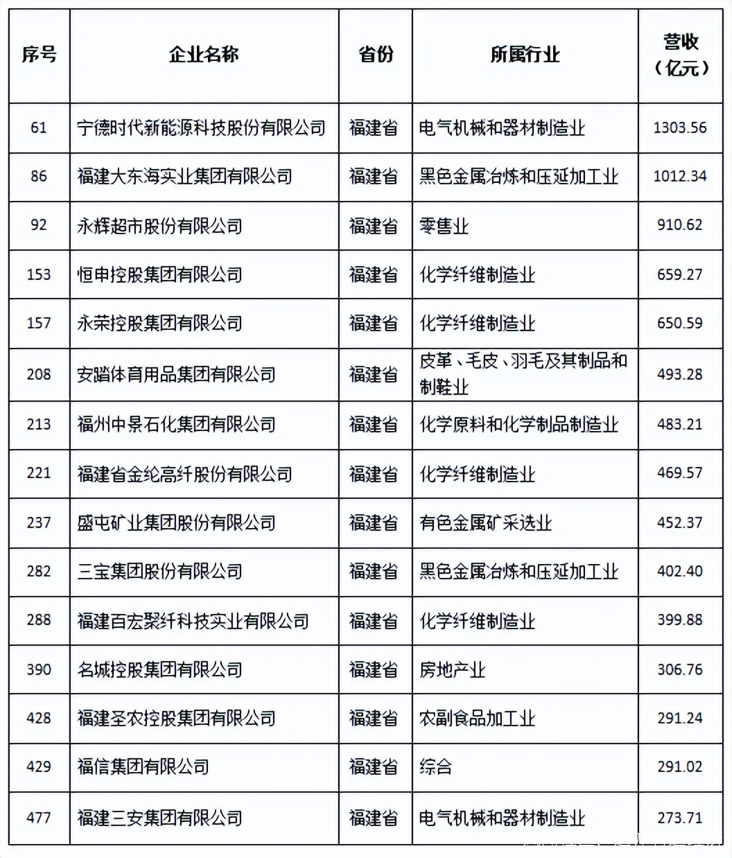 榜單以營收論英雄,福建上榜企業前三分別為:寧德時代1303億居第61位,大東海實業集團1012億居第86位,永輝超市910億居第92位。