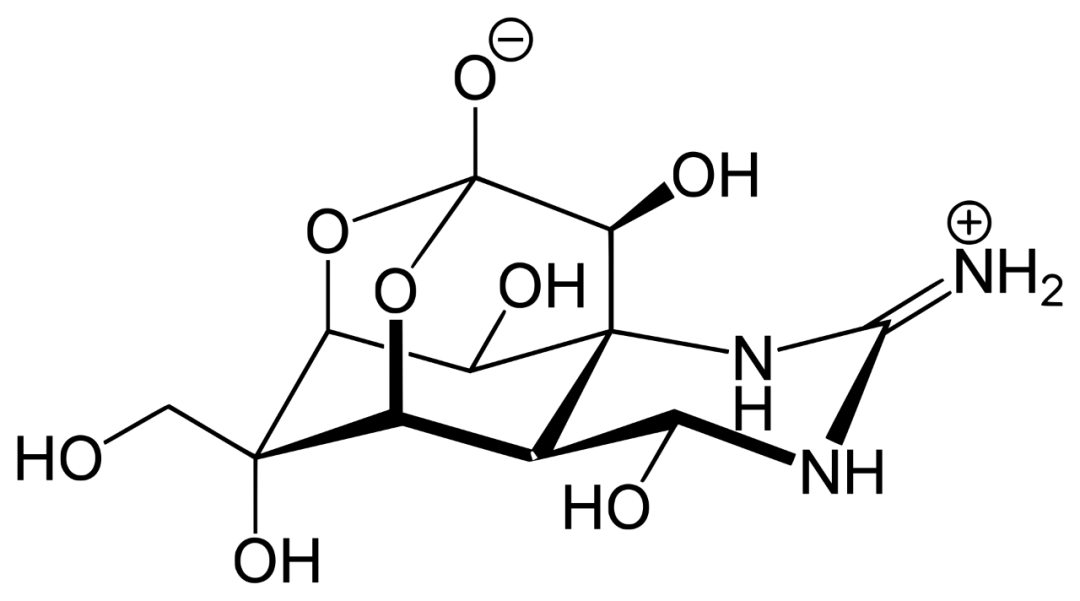 TTX 是一個看起來頗有些眼花繚亂的分子。其實,分子的碳骨架並不複雜,只是一個環己烷外加 C1、C2 側鏈,但與之形成鮮明對比的,是上面密密麻麻的官能團。
