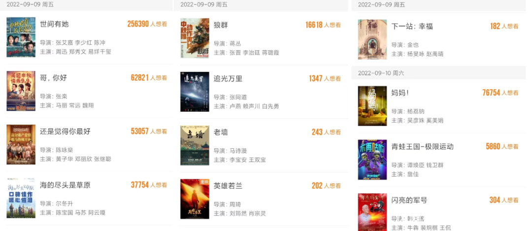 不論如何,12部電影,這個陣容已經遠遠超過了往年中秋檔同期水準。