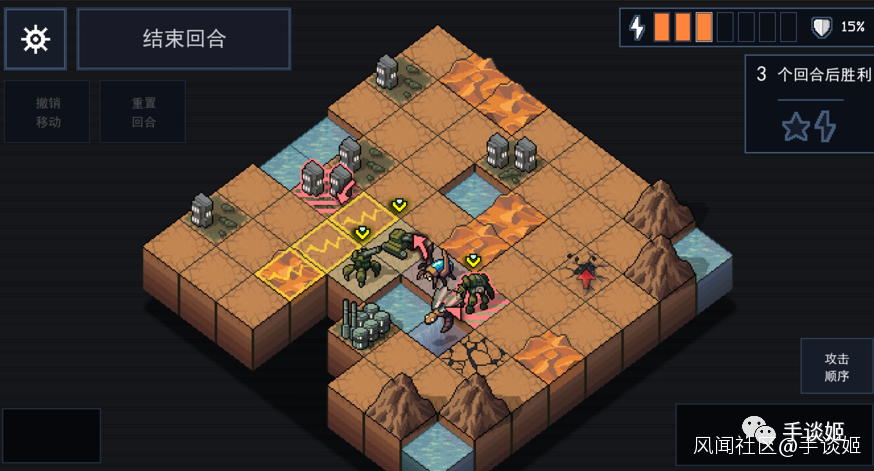 策略採取的依據是,玩家可以監測到大蟲子們下一步的行動,比如説玩家看到大蟲子下一回合會向右打到城市,那麼只需要把蟲子打出位移,它下回合還是朝右打,但就會打空。通過類似的思路,儘可能地保護民眾在規定回合內不受到傷害,這就是《陷陣之志》想要帶給玩家的了。