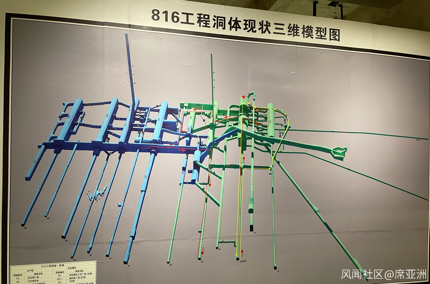 816工程三維模型圖,最左側一小段為“產品庫房”,存放製造武器級鈈,藍色部分通道可以看到挖通了若干地下溶洞,其中部分用於存放核廢料,綠色部分幾條比較淺的通道是通往外部,頂上分成三叉的部分是一個隱蔽的防禦陣地,圖中最大的一個地下廠房就是反應堆大廳。從頂部進排氣通道來看,這個設施的最高處距離山頂約為150米(煙囱本身150米,加上地下部分總共300米)