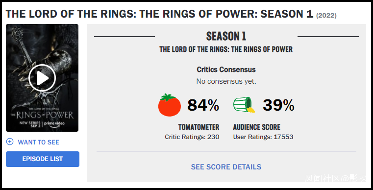 爛番茄新鮮度84%+豆瓣7.4分,顯然《力量之戒》並非像營銷號説的一文不值。