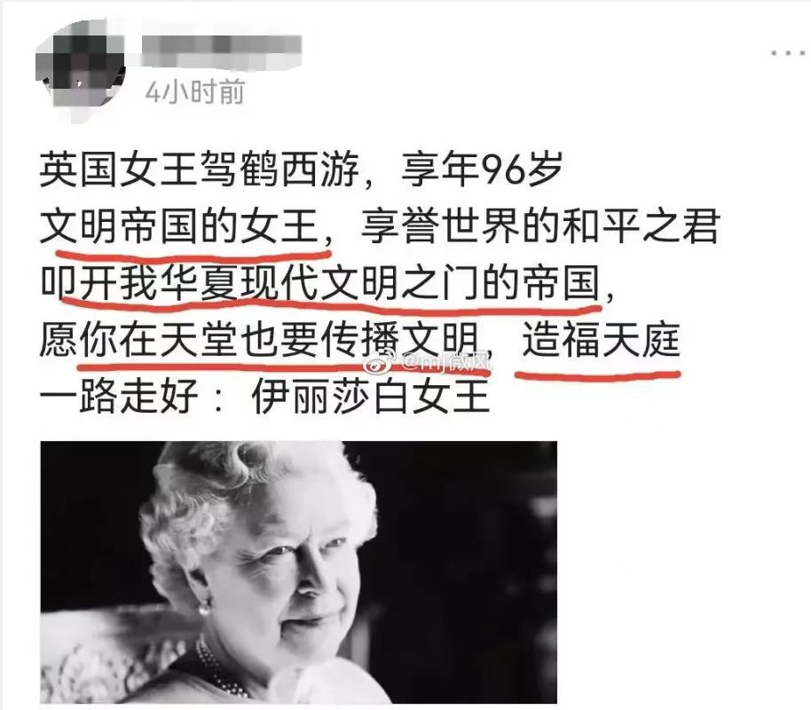伊麗莎白二世96歲壽終正寢,對一個普通中國人來説,應該和戈爾巴喬夫、安倍晉三死了一個檔次,沒什麼區別。我們是人民民主專政的社會主義共和國,既沒有君主,也沒有貴族……我們操人家的心幹嘛?