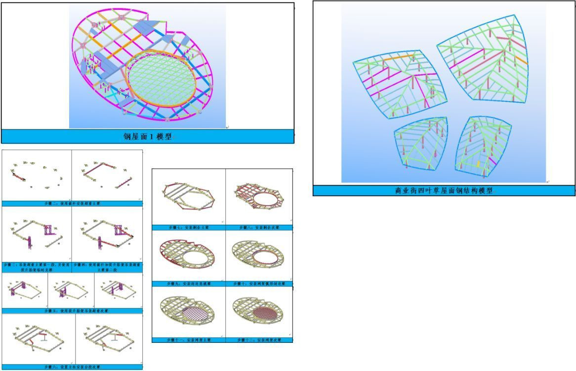 異形大跨度鋼屋面的新穎設計給施工單位鋼結構深化設計及安裝帶來了不小的難題。其一,部分鋼結構現場無塔吊覆蓋,最高構件頂部標高31m,構件重量較重,附近地面為首層無樑樓蓋,汽車吊噸位受限。針對以上難點,施工單位秉承“以創新為引擎,以科研為驅動。”理念,積極應用“BIM技術”進行鋼結構建模、吊重分析、垂直起重設備站位分析及安裝模擬,最終確認現場無塔吊覆蓋的部分鋼結構,深化設計時應合理分段,降低單個鋼構件重量,安裝部分豎向構件時一次安裝兩層,懸挑構件最後安裝,避免汽車吊卡杆,同時也降低了汽車吊的噸位,避免了地下室首層樓板收到過大荷載。其二,鋼屋面為網殼結構,中部存在洞口,洞口底部為負一層(垂直高度35米),洞口上方頂部為網殼結構,網殼橫跨鋼樑寬度不足100mm,人員無法行走,且結構跨度大、中部無支撐。施工單位經BIM技術研究分析後,確認採用“先主杆件,後補次杆件”的安裝思路,即網殼貫通超長主杆件地面拼裝,整體吊裝,最後補檔吊裝次杆件,分類作業、集中防護;次構件補檔施工時在負一層洞口下方設置一台伸臂車,其高空作業平台間作業人員送至不同作業位置,進行次杆件安裝、校正、焊接,禁止作業人員在杆件上方行走。