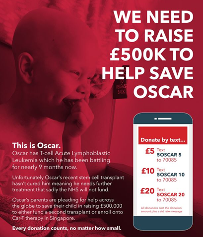 籌款期間,英國伯明翰兒童醫院給奧斯卡做第二次造血幹細胞移植。