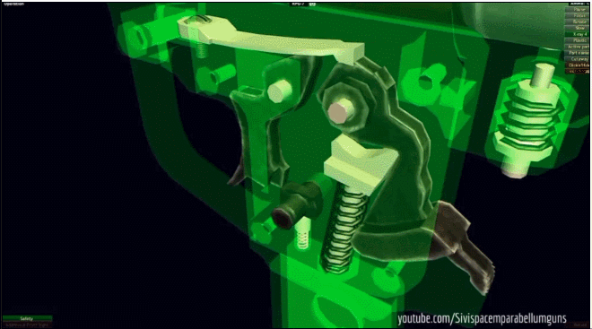 在扣動扳機之前,必須要打開保險,這個保險是一個圓柱狀阻鐵,能夠阻擋扳機運動,將阻鐵向左推開後,保險打開,扣下扳機就可以發射了。