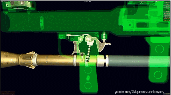 RPG2的扳機機構可以簡單理解為一個單發的手槍,只不過擊錘不是朝前擊打,而是朝上擊打。火箭彈的中間位置有一個底火,彈頭位置有一個用於定位的凸起,正好與發射頭前端的缺口相配。