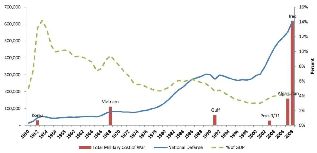 資料來源:國防支出與GDP:行政管理和預算局;歷史表格:美國政府預算,2010財年;戰爭軍費:斯蒂芬﹒達蓋特,美國主要戰爭支出,國會研究服務處,2008年7月