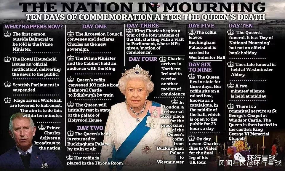 以英女王去世的當天為**“D-day”**,“D”為當日之意,這是歐美社會對大事發生的約定叫法。那麼D-day之後的十天內,英國全境進入一個哀悼期。