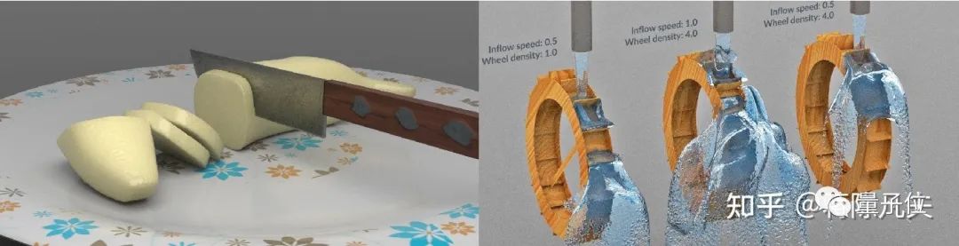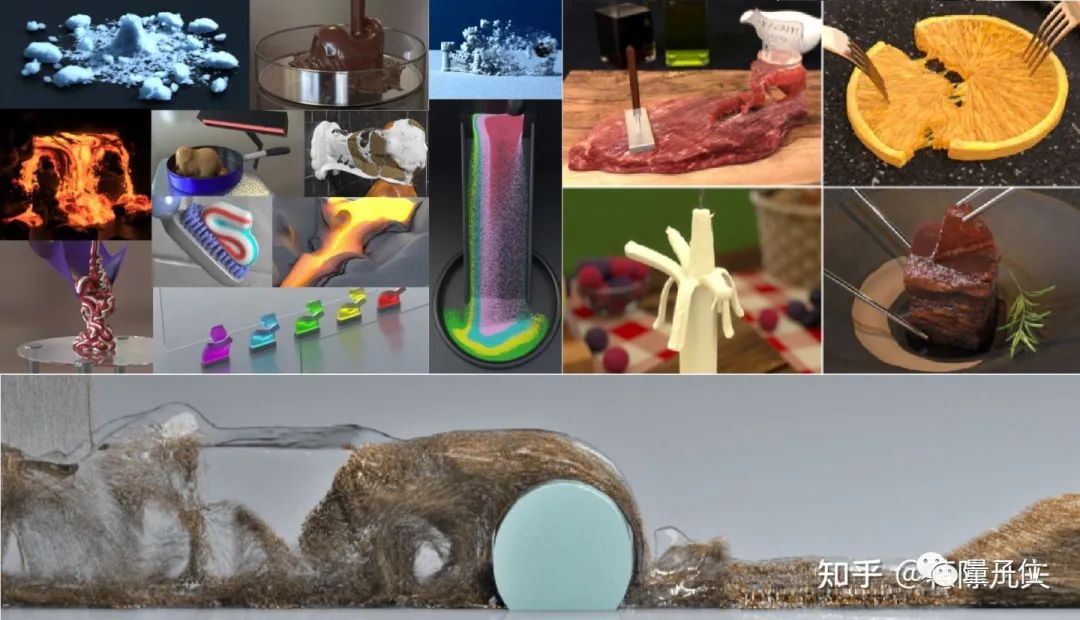 於是從面子上看到的,便是我與一干志趣相投之士用MPM去平A物理的世界的各種固體和流體:巧克力,果凍,麪包,牙膏,冰淇淋,泡沫,泥土,岩漿,牛排,東坡肉,橘子,西瓜,肌肉,骨骼,內臟,布料,毛衣,頭髮,雪山,沙海,冰川,河流,無人機,炸藥,等等。這裏有固體,有牛頓流體,有非牛頓流體,有粒狀體,有固液混合體,還有人體。大到山川河流,小到雨露甘霖,MPM從一個鐵頭功,逐漸被擴寫成了一本七十二絕技。