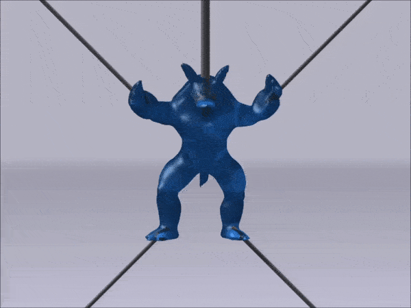 第一個成果,是我們在剛體仿真上取得的重大成就。剛體與柔性體自古以來便被分開處理,求解它們的方法不能説是關係不大,只能説是幾乎毫無關係。在IPC的加持下,我們提出了嶄新的“Affine Body Dynamics (ABD)” 仿射體動力學,在淘汰傳統剛體模擬的路上直接飆到終點,讓剛體重新迴歸成它們在真實世界中的樣子:即使最硬的物體,也會微小的形變,硬度是振金還是木頭,該是多少就是多少,不需要被假設成絕對剛體。在ABD技術的加持下,我們在擁有所有IPC優點的同時,達到了媲美現有剛體引擎的速度和全方位碾壓的精度。高速而又精準的機械體仿真首次成為可能。