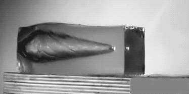 那時我學完了計算固體力學。跟許多做仿真的初學者一樣,一切都是從模擬果凍開始,畢竟果凍是最典型的彈性體,並且往往很軟,不會給ODE(常微分方程)的時間步離散格式帶來過分stiff從而要麼dt小,要麼系統難解的這個數值問題。於是在彈塑性固體裏面,我找到一個想要模擬的案例:子彈射穿果凍。那時乃至今日看來,都沒有多少比這更炫酷的實拍視頻: