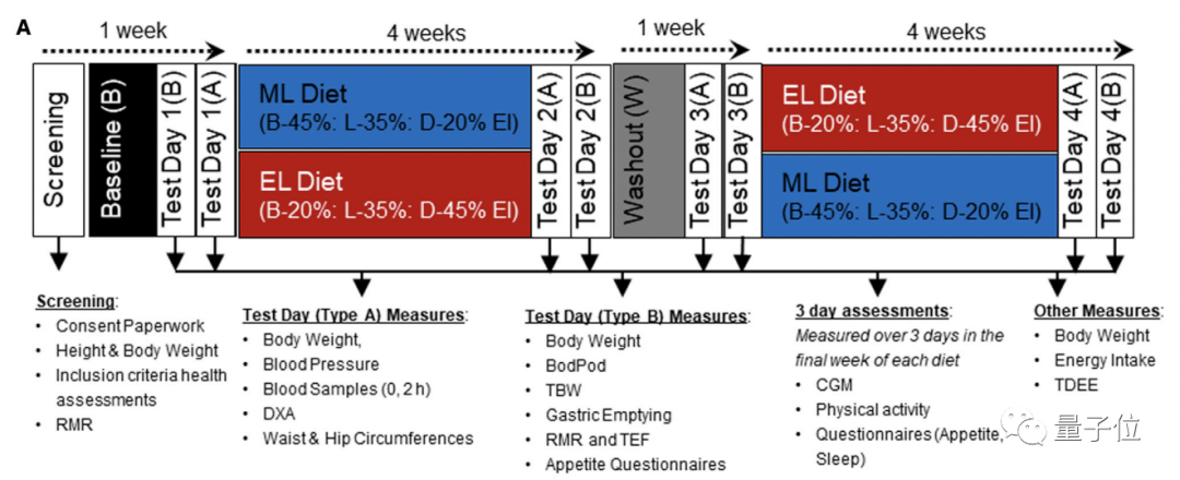 具體到執行,受試者們被隨機分配為兩組,兩組每天進食的總熱量是一致的,但早中晚飯的比例不同。