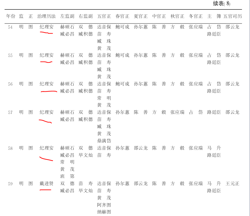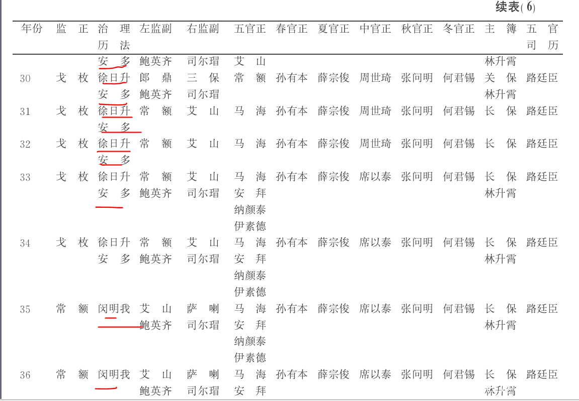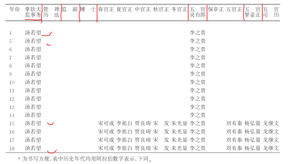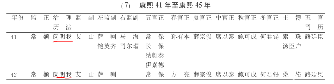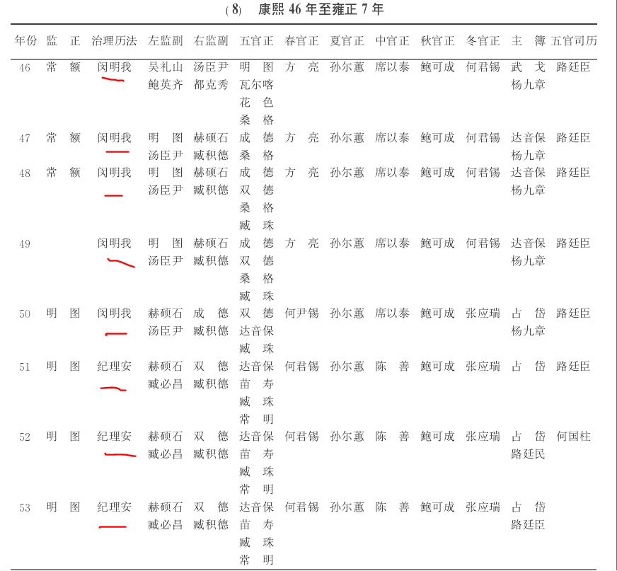 (4)按照清代制度,時憲書局每年皆須預為下年編修《時憲書》,並於當年十月正式頒行。《時憲書》上所列監正、監副、左右監副及五官正等官名單,均為上報皇帝得到批准列名之官員。故本表不表現官員之變動情況。
