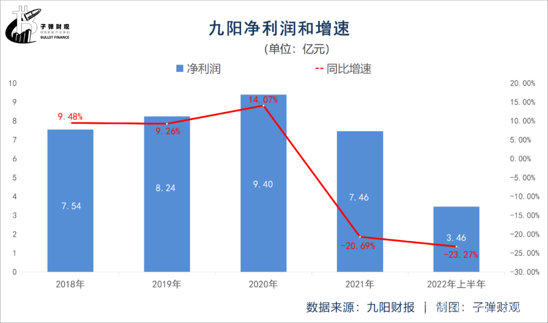 財報顯示,2022年上半年九陽的淨利潤為3.46億元,較上年同期的4.51億元下滑23.27%。