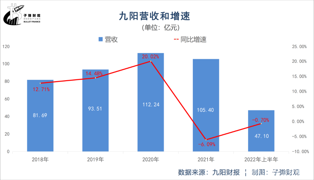 先看營收。根據已公開的財報,2022年上半年九陽的營收為47.10億元,較上年同期的47.44億元下降0.70%。