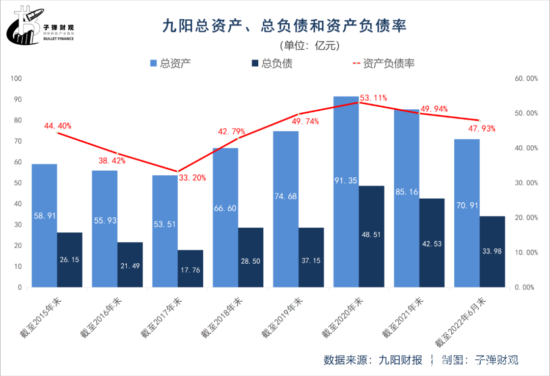 除了現金流向好之外,九陽的償債能力指標也位於較為健康的水平。根據財報,截至2022年6月末,該公司的資產負債率為47.93%。
