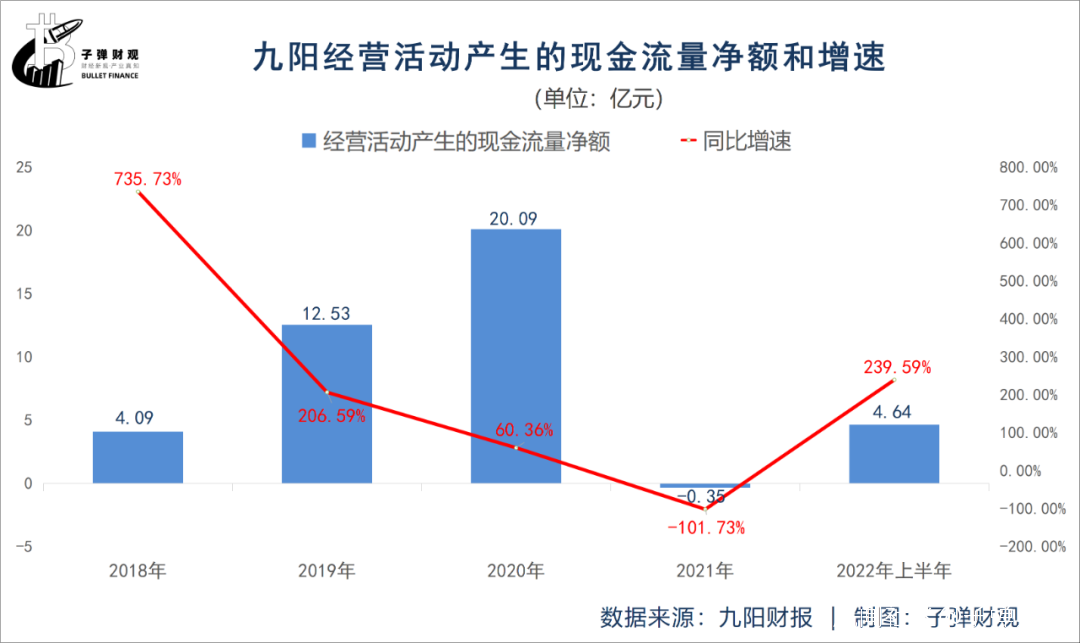 從客觀層面來説,該公司的表現還是有可圈可點之處。就拿現金流來説,最新財報顯示,2022年上半年九陽經營活動產生的現金流量淨額為4.64億元,較上年同期的-3.32億元增長239.59%。
