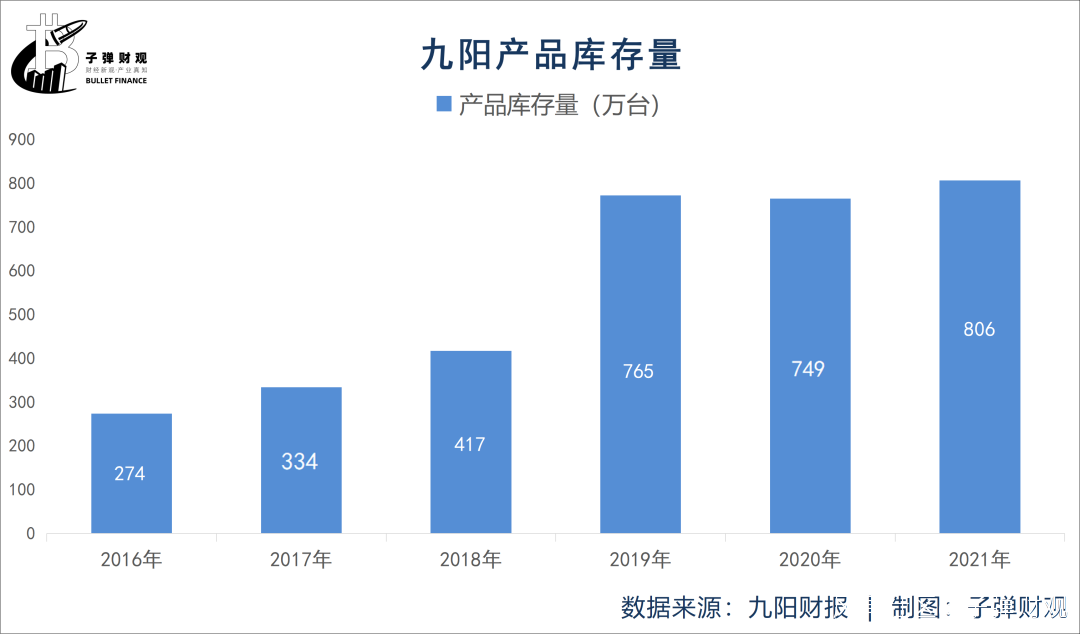 首先,九陽正深陷產品庫存增加的窘境。九陽披露的財報信息顯示,2016年該公司的產品庫存量為274萬台,到了2021年,這一數值已飆升至806萬台,暴漲近2倍,達到194.16%。