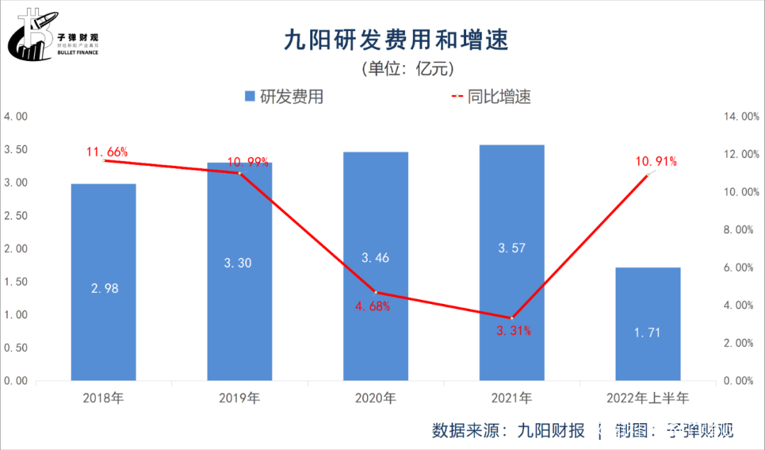 當然,上漲的不止九陽的管理費用,也包括其研發費用。根據九陽往期財報,2022年上半年該公司的研發費用為1.71億元,較上年同期的1.54億元增長10.91%。