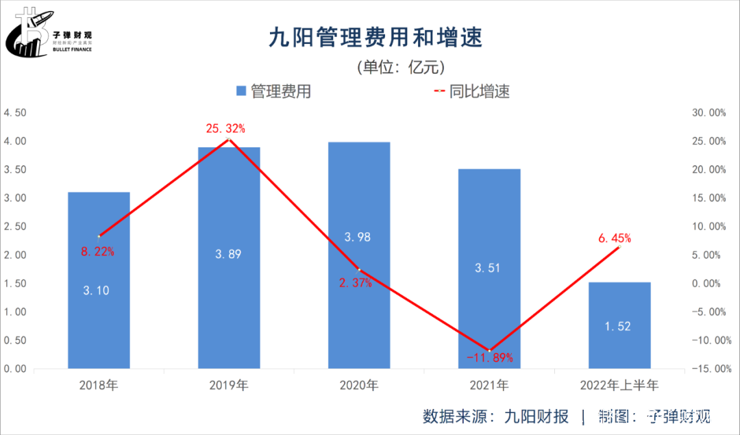 而在此前的4個年度裏,除了2021年九陽的管理費用增速為負,其他年度該公司的這一數值均為正值,分別為8.22%、25.32%和2.37%,平均增速達11.97%。