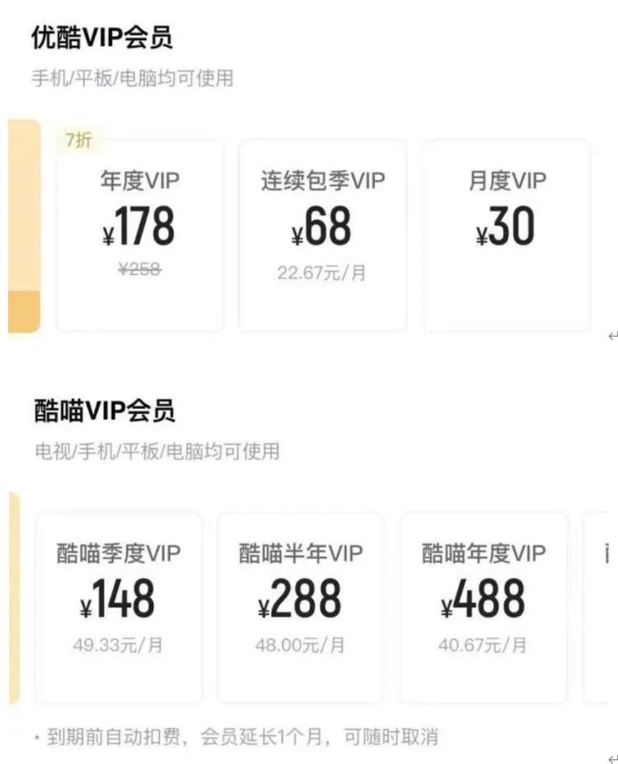 要知道,電視端視頻會員的價格與手機端差別很大。以優酷為例,其手機端VIP年費為178元,電視端酷喵VIP年費則為488元。對於經歷了十年燒錢大戰、至今連年虧損的各家視頻平台來講,這筆收入不可謂不香。