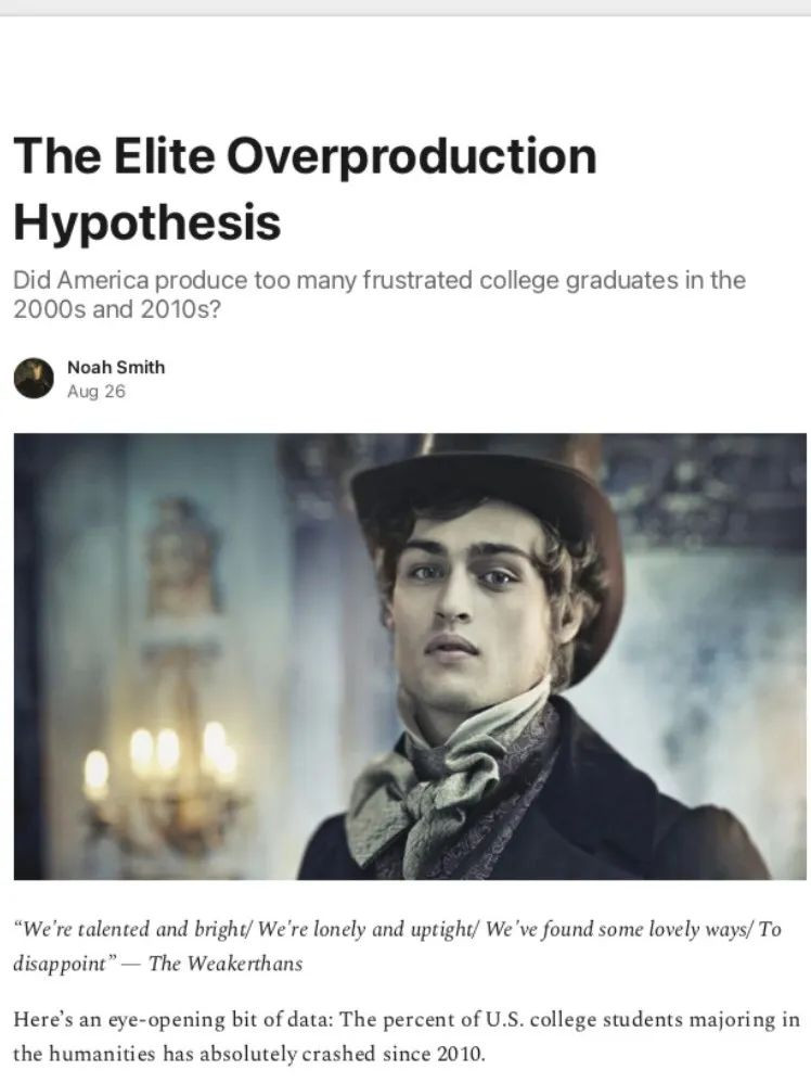 厄本有些刻薄,我不認為人們應該為自己抱有很高期望而被嘲笑。**試想一下現在的文科生,他們在大學裏過着知識分子的生活,讀了數十本書、有着對社會、歷史、和人生意義的深刻想法,並花了很長時間與聰明的人辯論。**而且很多還是家裏第一個上大學的人,揹負着父母過上好生活的期望。而且他們一直被告知,大學是進入社會前20%的入場券。最重要的是,幾乎每個人都告訴他們,他們可以做讓自己感到滿足的工作,做有益於世界的事,做利用到大學知識的事。