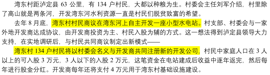 134 户村民繳納一定的入股資金,參與當地水利開發——灣東河邊村民成水電站股東: _