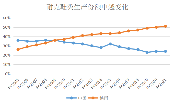 老牌巨頭耐克和阿迪達斯的轉移更直觀一些——兩家公司都是從21世紀初開始逐漸降低在中國的生產份額,並在越南等東南亞國家不斷加碼。