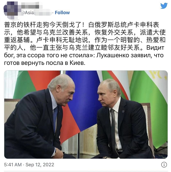 9月12號,他們還做了專題節目,請了“磚家”解説,大致意思就是:烏克蘭這波攻勢,讓白俄羅斯感到害怕。 對於白俄羅斯來説,參戰將是自殺,盧卡申卡非常明白這一點…所以盧卡申科準備示好烏克蘭當局了…