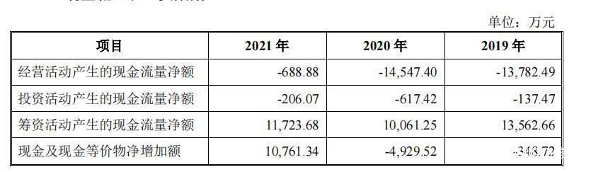 2019-2021年,潤際新材經營活動產生的現金流淨額連續為負,分別為-1.38億元、-1.45億元、-688.88萬元。