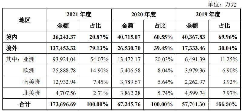 招股書顯示,2019-2021年,潤際新材境外市場銷售收入分別 1.73億元、2.65億元、13.75億元,外銷收入逐年增長。其中亞洲地區銷售收入佔營業收入的比例分別為11.25%、20.03%、54.07%,是主要銷售區域,歐洲地區佔比分別為6.90%、8.04%、14.90%,南美洲地區佔比分別為3.92%、5.64%、7.45%;北美洲地區銷售收入佔外銷的比例分別為7.97%、5.74%、2.71%,銷售收入分別為4599.74萬元、3862.28萬元、4707.56萬元,2020年銷售金額和佔比呈下降趨勢,主要系北美地區客户DJJ對錳劑產品需求下降,2021年隨着電解錳和金屬硅市場價格的上漲,北美地區銷售收入有所回升。
