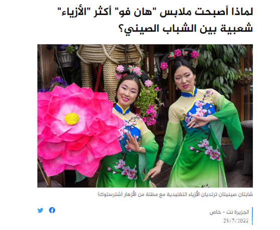 2022年7月29日,卡塔爾半島電視台的阿拉伯語官網發表了一篇《為什麼“漢服”日益成為中國青年的“時尚”?》,並且標明是半島的特稿,發自北京。看來可能是受到“迪奧竊裙”事件的影響,但全文並沒有提到那一事件。
