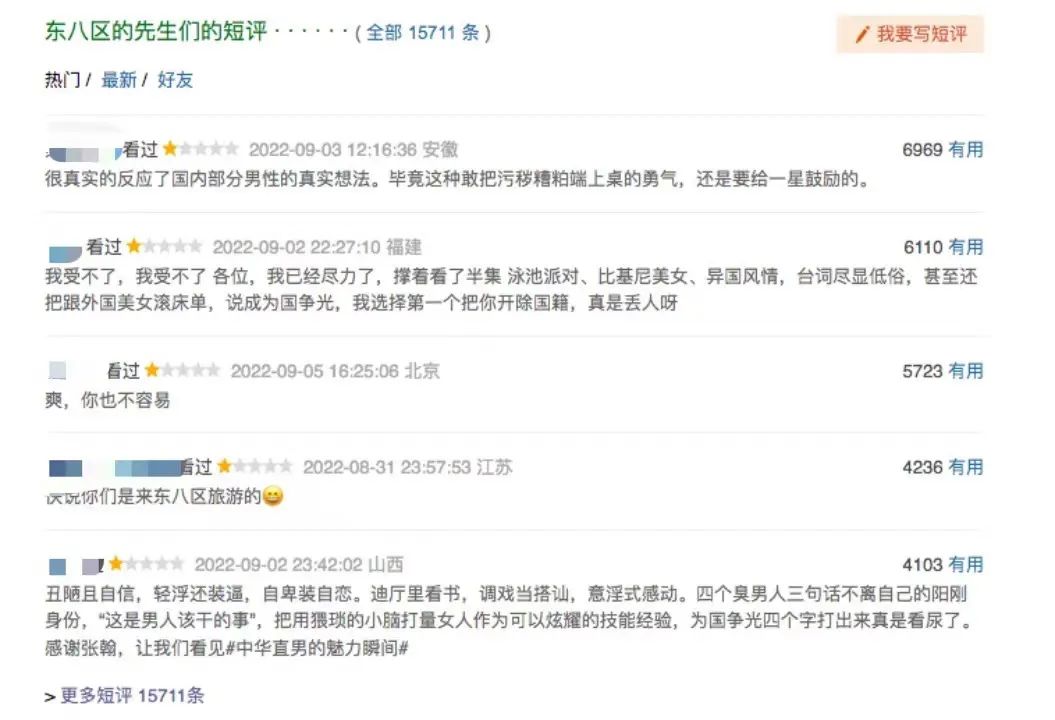 開播以來,《東八區的先生們》的豆瓣評分一直在3分以下波動,截至發稿前定格在2.2分,打分人數已經超過7萬,1星比例高達96%,成功坐上了豆瓣國產劇最低分的寶座。
