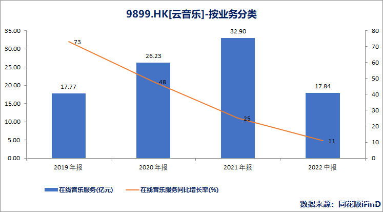 數據顯示,2019年-2022年上半年,網易雲音樂在線音樂服務營業收入分別為17.77億元、26.23億元、32.9億元和17.84億元,對應營收增速分別為73%、48%、25%和11%,營收增速逐年放緩跡象明顯。